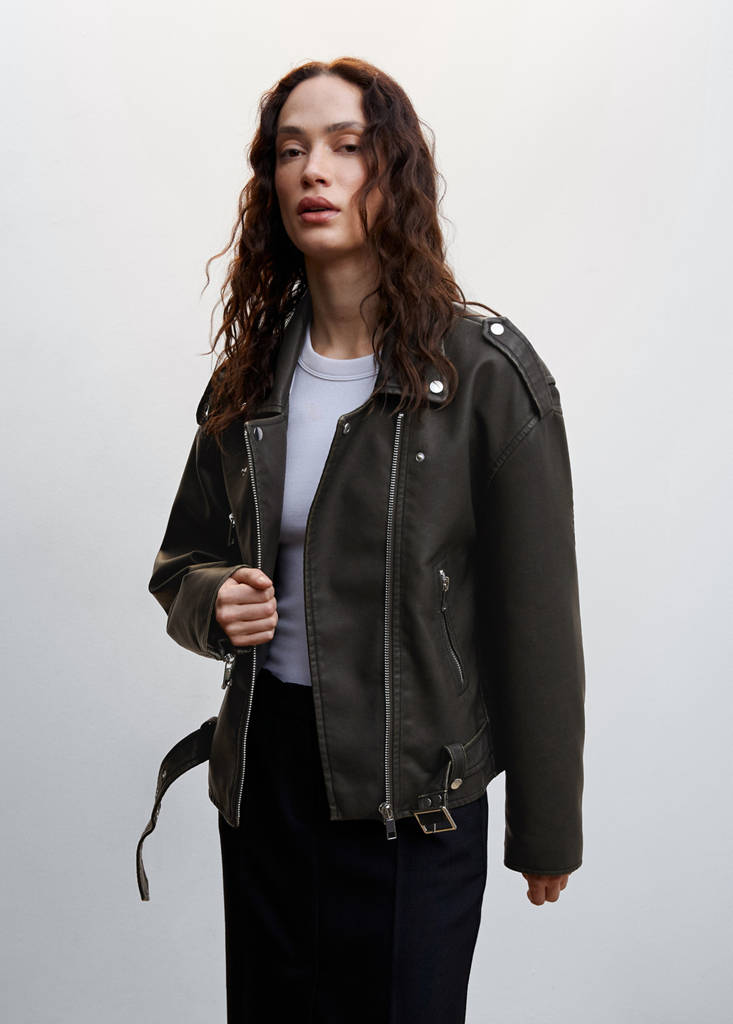 Faux leather. Faded. Oversize design. Lapel-collar V-neck collar. Long sleeve. Three zipped pockets. Metallic buttons. Zip fastening on the front section. Adjustable belt. Festival Season
