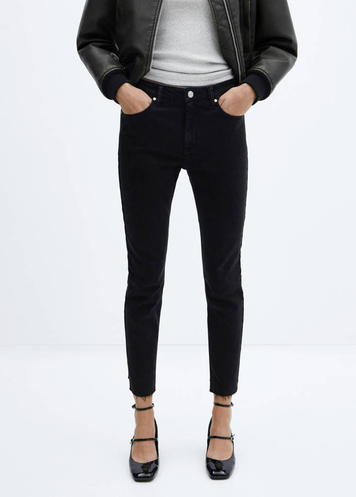 Denim-style cotton fabric. Stretch fabric. Skinny fit. Crop design. Mid-rise. Frayed finish. Belt loops. Five pockets. Zip and button fastening. Inseam 68 cm. Available Plus. Cotton fabric. Frayed hem