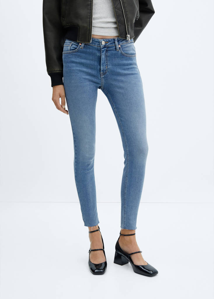 Denim-style cotton fabric. Stretch fabric. Skinny fit. Crop design. Mid-rise. Frayed finish. Belt loops. Five pockets. Zip and button fastening. Inseam 68 cm. Available Plus. Comfort fabric with elasticity. Loops on the waist. Long Long. Wide leg silhouette. High Waist. Long design. Wide-leg design. High waist. Button and zip fastening. Inseam 83 cm