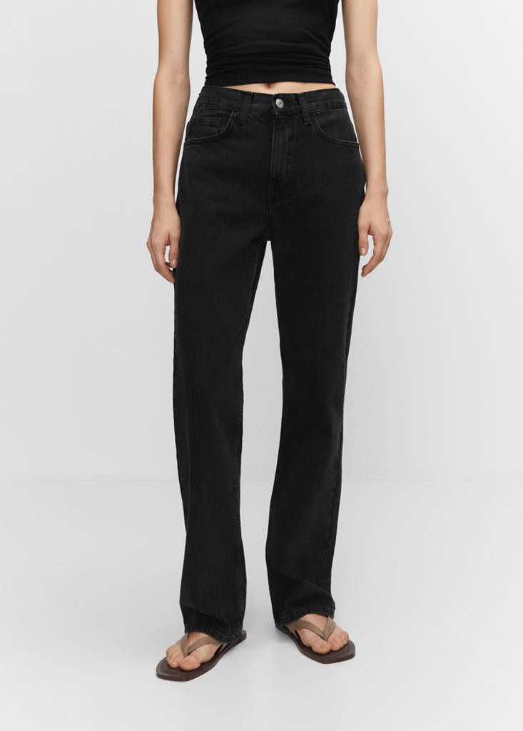 Recycled cotton-blend fabric. Denim style cotton fabric. Straight design. Long design. Medium waist. Two side pockets. Two patch pockets on the back. Loops. Zip and one button fastening. Inseam 78 cm
