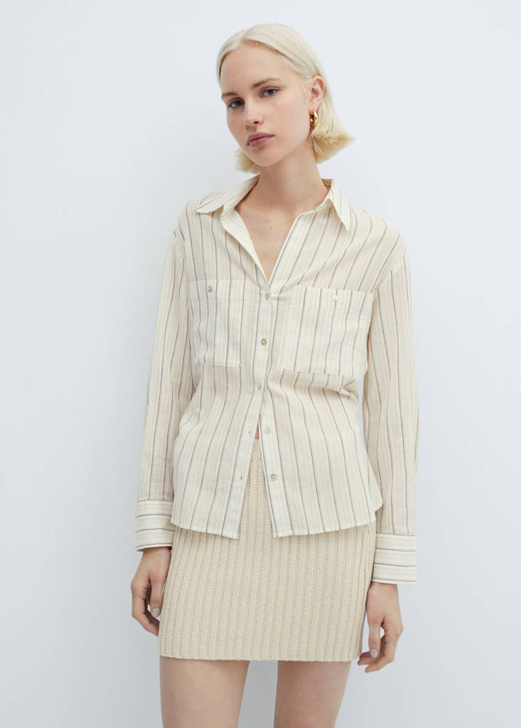 Cotton blend fabric. Straight design. Striped print. Shirt collar. Long sleeves with buttoned cuffs. Two patch pockets on the chest. Concealed button closure on the front. Metallic thread detail