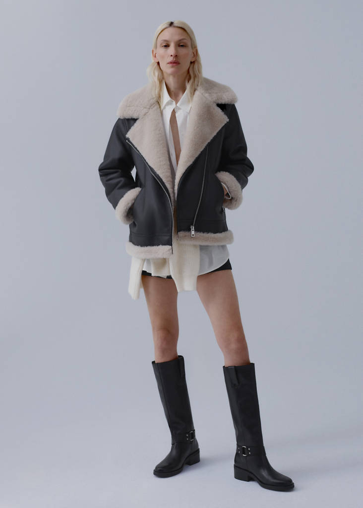 100% bovine leather. Biker design. Tall leg. Block heel. Round toe. 3 cm heel. No Fastening. Decorative buckle