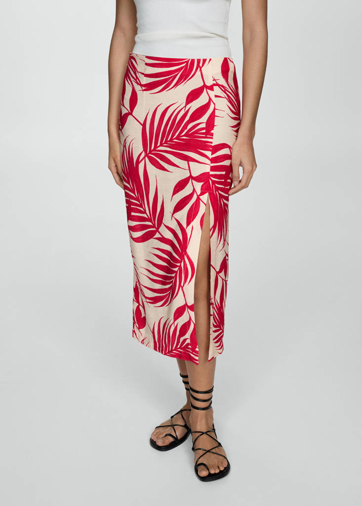 Fluid fabric. Straight design. Midi design. Mid-rise. Tropical print. Side slit. Available Plus.