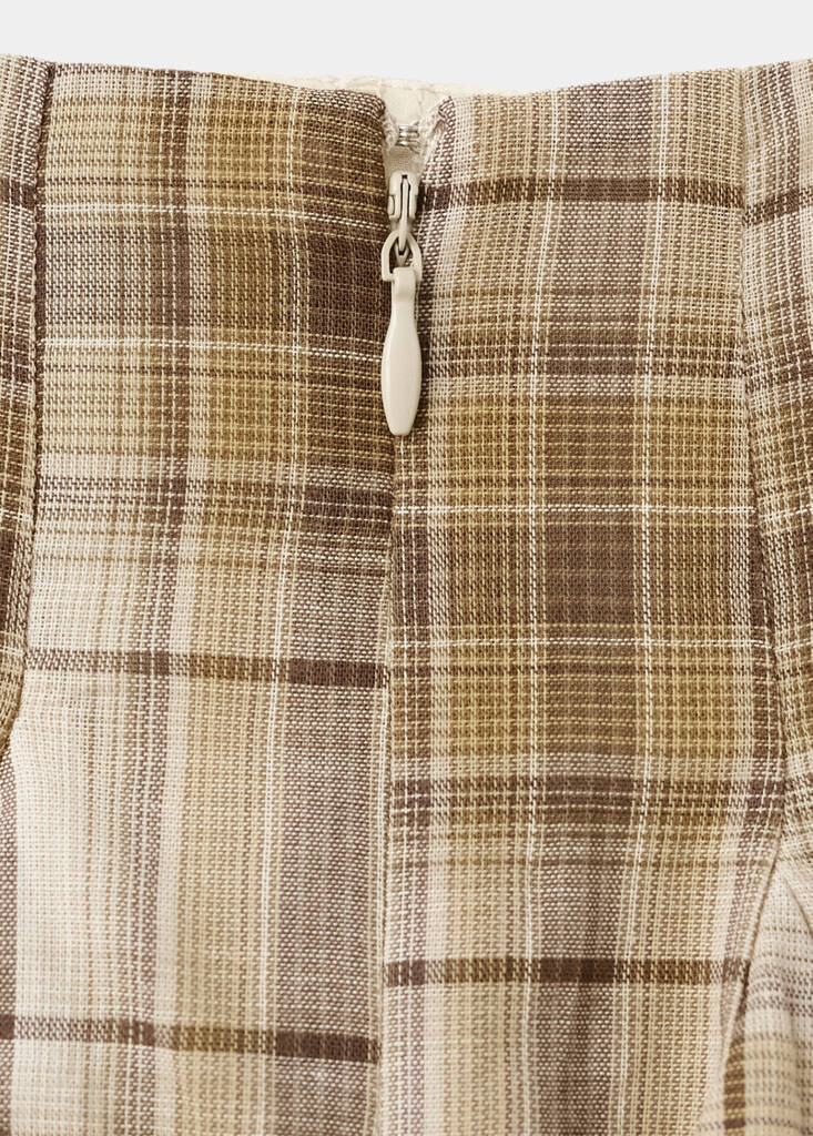 Crafted from 100% cotton fabric, this garment features a short, straight design with pleats and checks. It includes a cotton lining, regular waist fit, and a rear zip fastening.