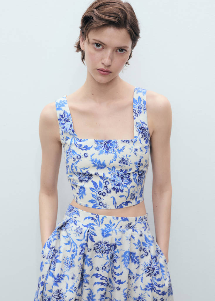 Crop design. Fitted design. Flowers print. Low neckline. Sleeveless. Wide straps. Elastic ruched panel at back. No Fastening. Total look