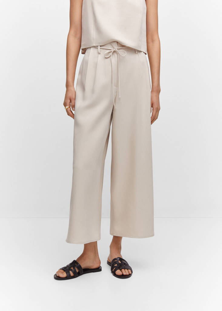 Fluid fabric. Wide-leg design. Crop design. Belt loops. Side pockets. Elasticated waistband. Removable bow on the waist. Total look
