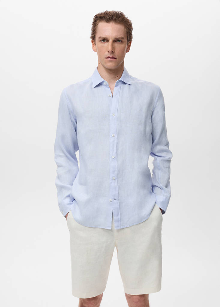 Regular fit. Tejido 100% lino. Cuello camisero. Cierre delantero con botones. Manga larga con puños abotonados. Detalle de pinzas traseras. Bajo redondeado. El color azul celeste es exclusivo online. El color azul porcelana es exclusivo online