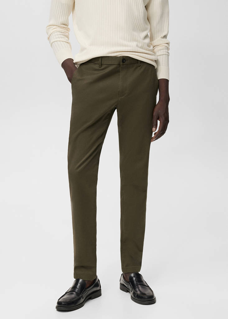 Slim fit. Estilo chinos. Tejido elástico de algodón. Trabillas para cinturón. Dos bolsillos laterales. Bolsillo portamonedas. Dos bolsillos de ribete en la parte posterior. Cierre de cremallera y botón