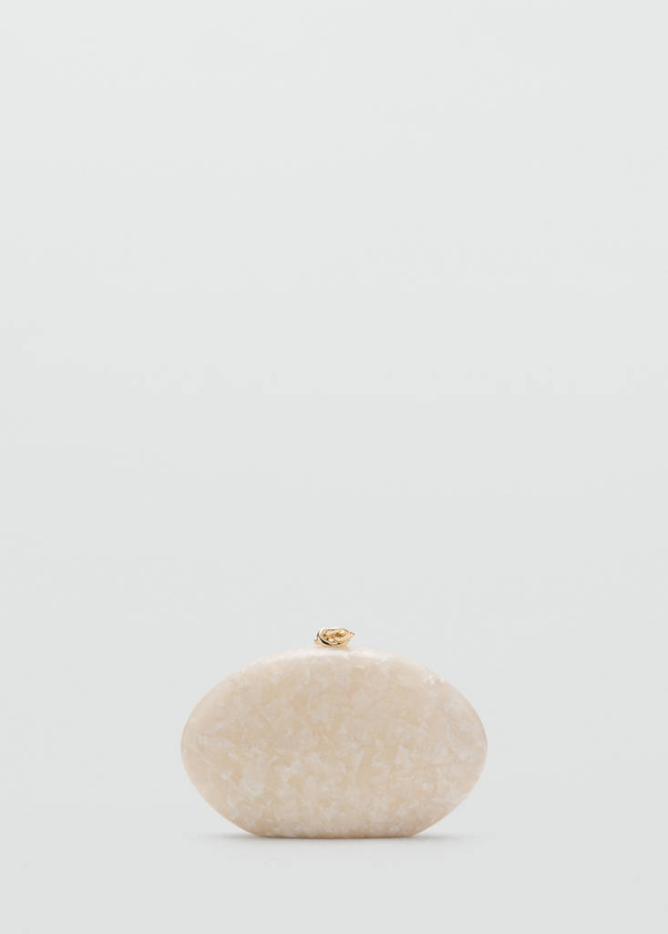 Diseño ovalado. Efecto perlado. Estilo clutch. Asa extraíble en cadena. Cierre metálico a presión. Forro interior 100% algodón