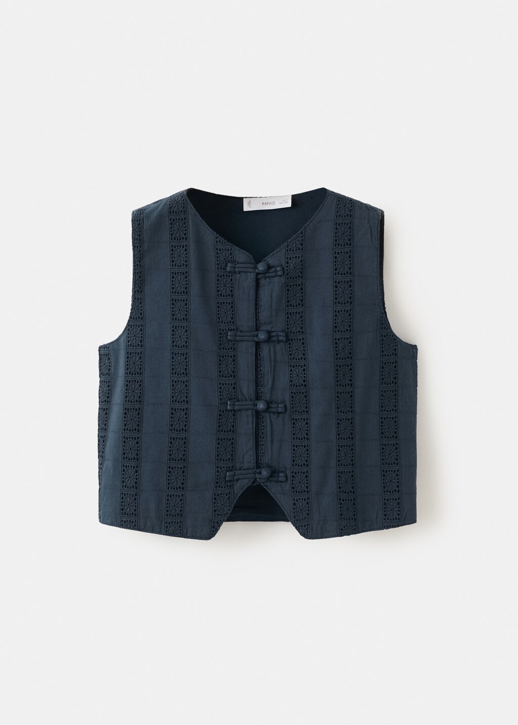 Tejido 100% algodón. Cuello redondo. Sin mangas. Cierre delantero con botones. Detalles bordados. Total look.