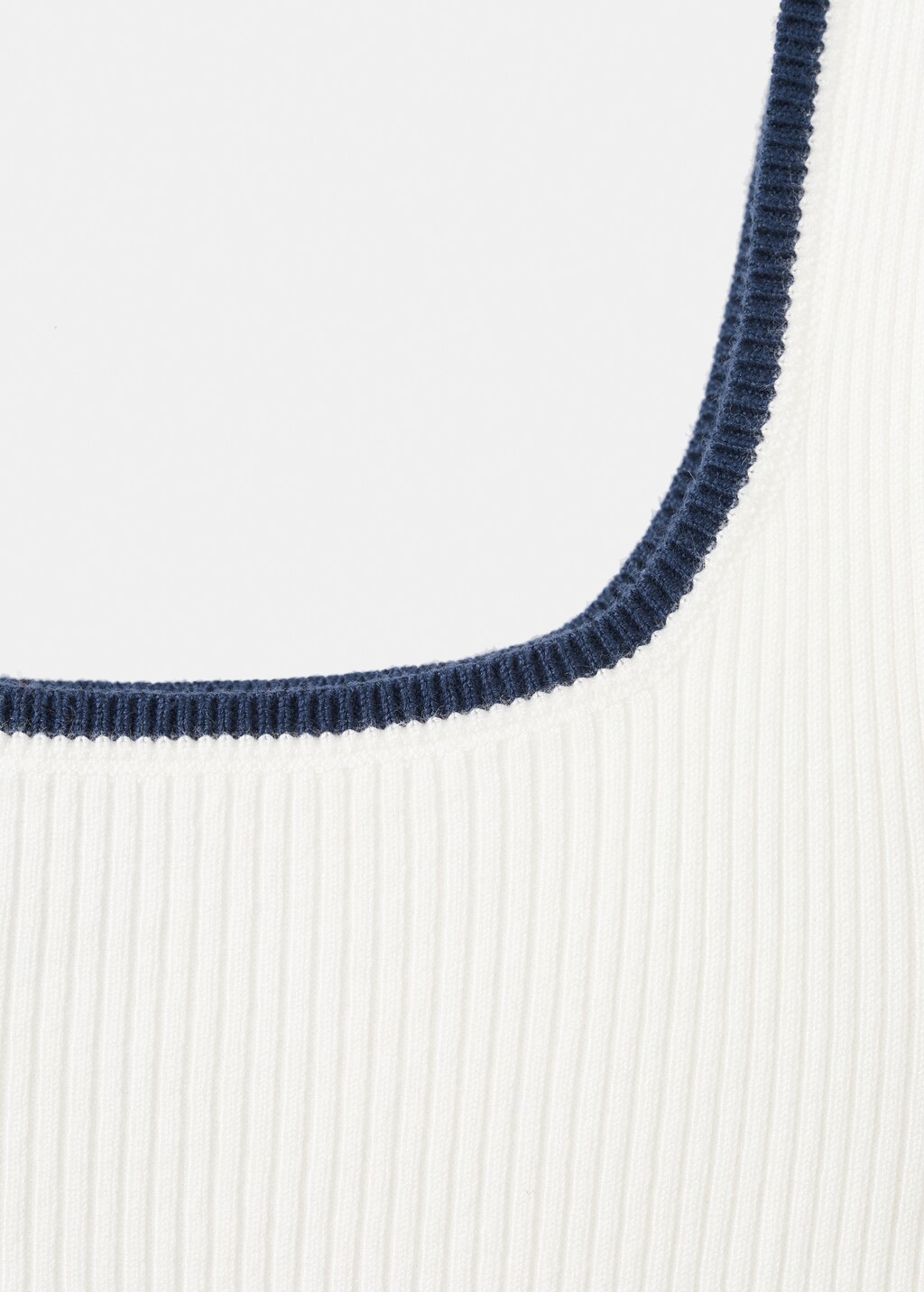 Tejido de punto canalé. Cuello recto. Diseño bicolor. Volantes en los tirantes.