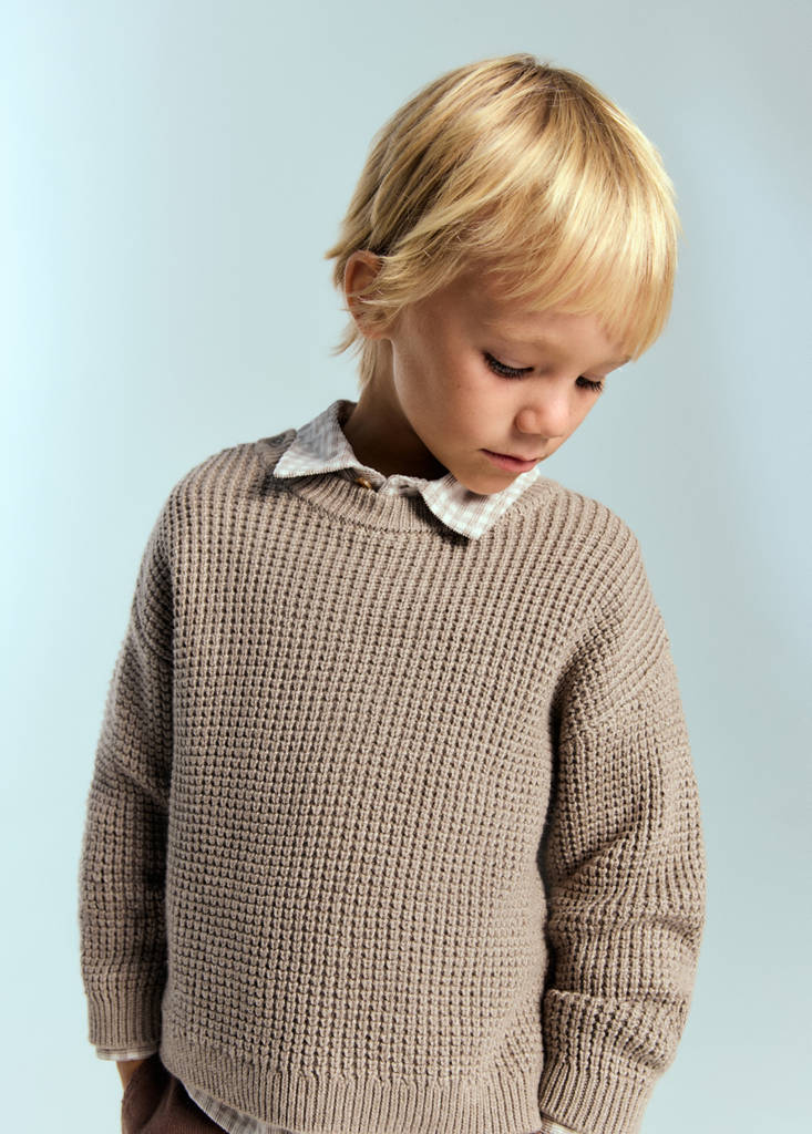 Knitted fabric. Straight design. Round neck. Long sleeves. Ribbed collar, cuffs and hem