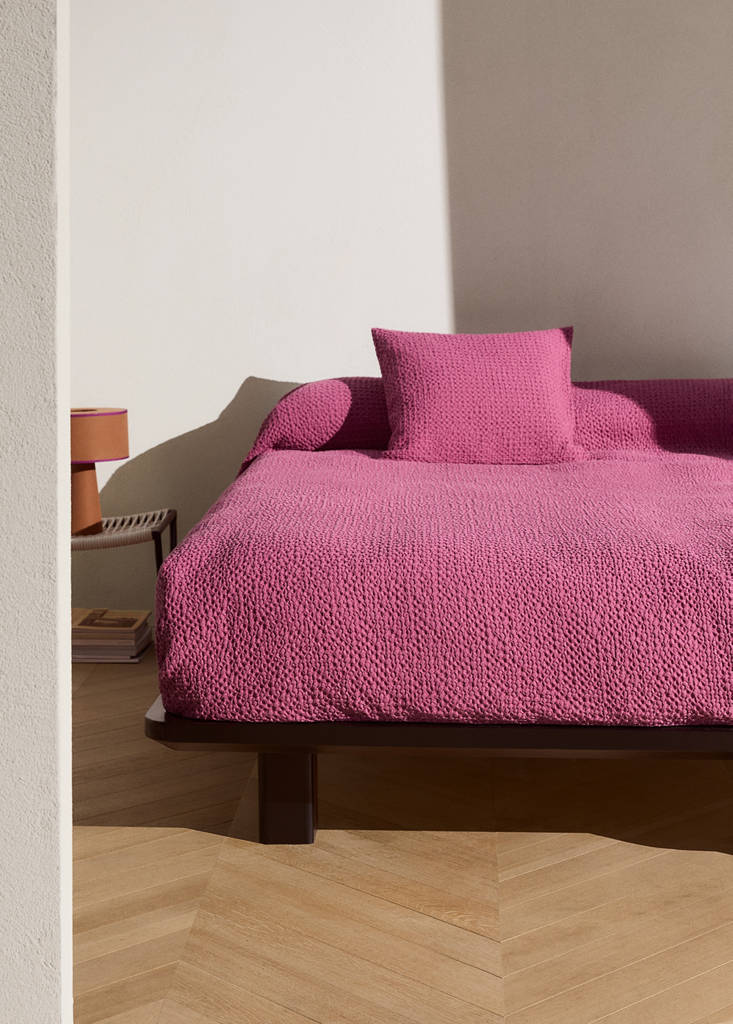 100% cotton fabric. Size: 180x250cm. 90cm Bed. Waffle effect garment-dyed bedspread with simple relief. Soft and comfortable texture to the touch. Coordinates with its matching cushion cover