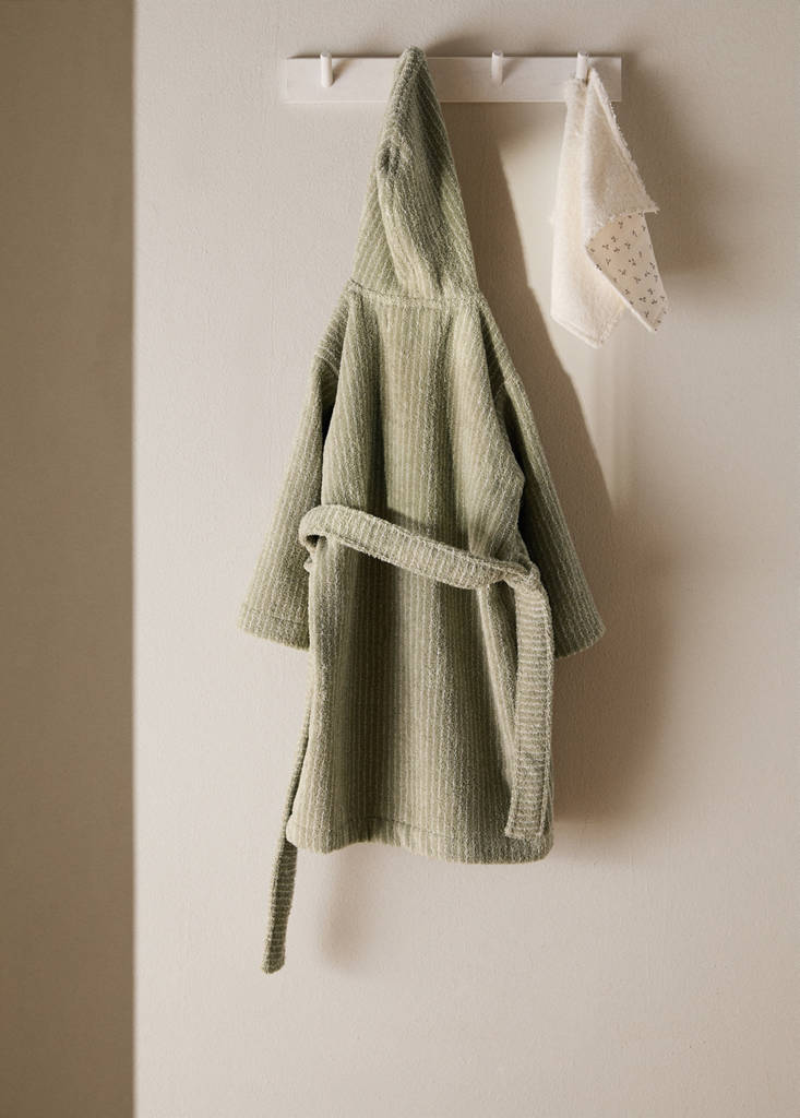 100% Cotton. For children aged 1-2. Striped design. Long adjustable strap. With hood. Highly absorbent and breathable for quick drying. Available in two colours
