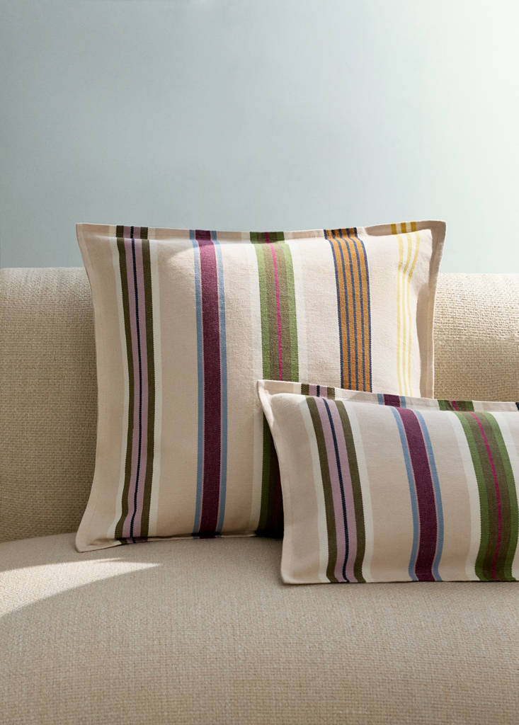 100% Cotton. Size: 50x50cm. Zip closure. With flap. Multi-coloured stripe design. Available in two colours. Coordinates with more products from the collection
