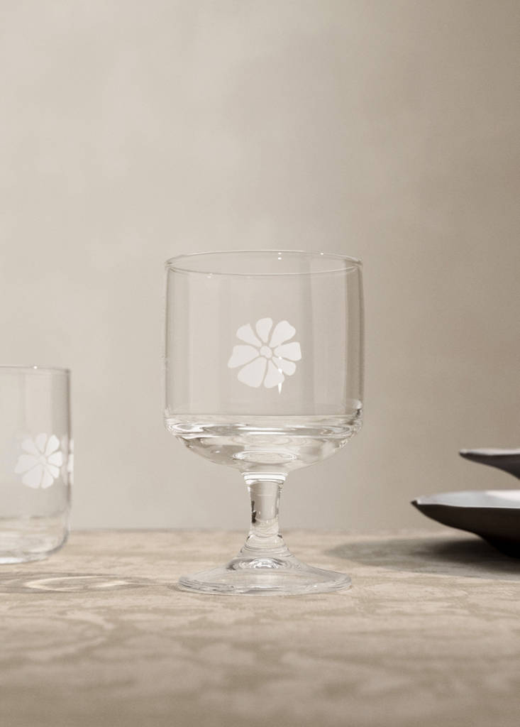 100% glass. Size: 7.6cm. Height: 12cm. Decorative glass goblet with flower. Floral design detail, perfect for adding an original, pleasant and elegant touch to your tableware. Coordinates with more products from the collection