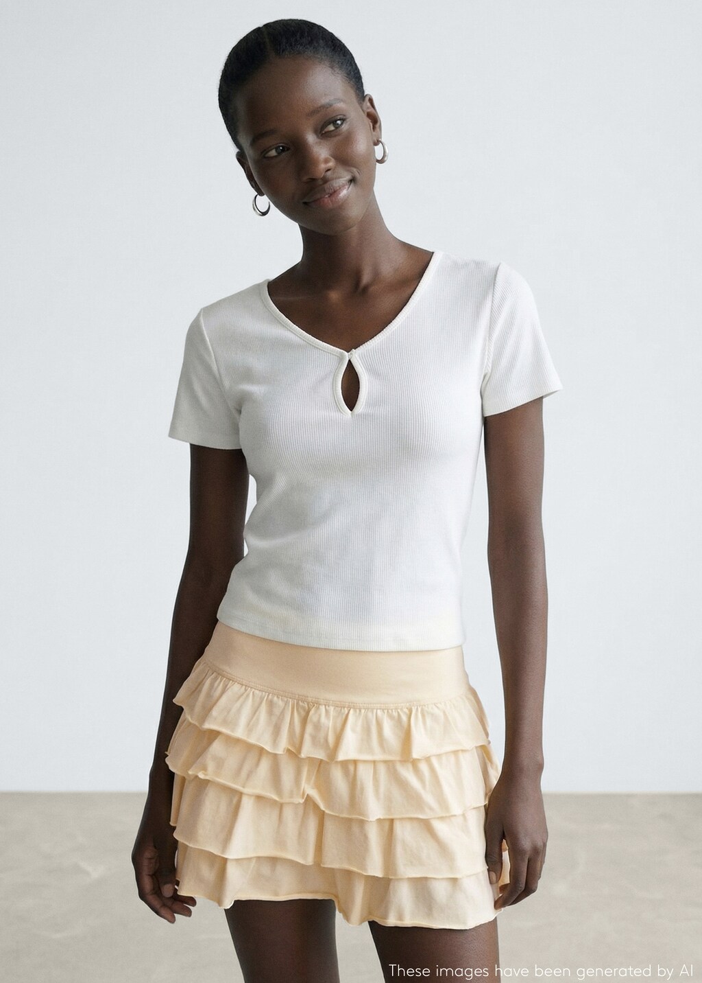 Cotton fabric. Straight design. Short design. Elastic pleated on the waist. Ruffle detail.