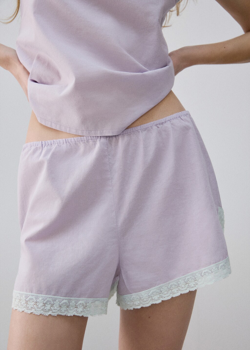 100% cotton pyjama shortsCurrent price [€ 25,99 ]€ 25,99Select a colourLilacThe model is wearing size S and is 178cm tall.Select your sizeSMLSize guideAddAdd to your wishlistSee lookFree delivery to storeSee availability in storeDescription100% cotton fabric. Plain design. Elasticated waist. Cushion cover with embroidered details.See detailsShare
