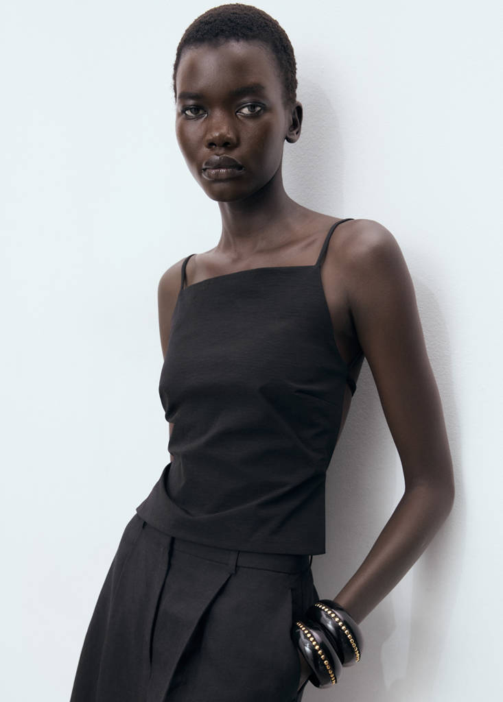 Featuring a fitted design, this top boasts an elegant square neckline and thin straps. It stands out with its open back adorned with ties, offering a style that enhances the silhouette.