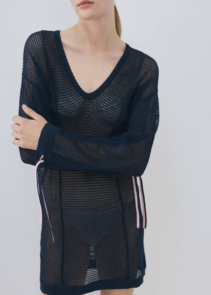 Katoenen stof. V-hals. Lange mouwen. Kort ontwerp. Netontwerp. Strikdetail op de mouw. Combineert comfort en stijl. Transparante stof