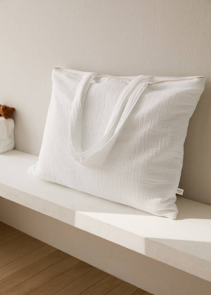 100% Katoen. Chiffonstof. Contrasterende overlock langs de boord. Fris, zacht, duurzaam, ademend, veelzijdig. Dubbele handgreep. Verkrijgbaar in verschillende kleuren. Combineer met meer producten uit de collectie