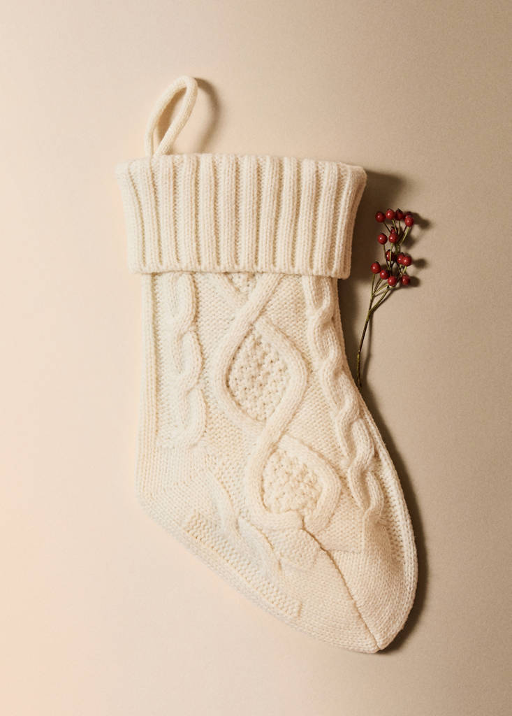 Eén maat. 100% kabelgebreide stof. Warme en gezellige kerstkous, gebreid in een elegant kabelpatroon dat zorgt voor een traditionele en verfijnde uitstraling. De bovenrand heeft een brede omslag met bies waardoor het structuur en een extra vleugje textuur heeft. Kerstcollectie