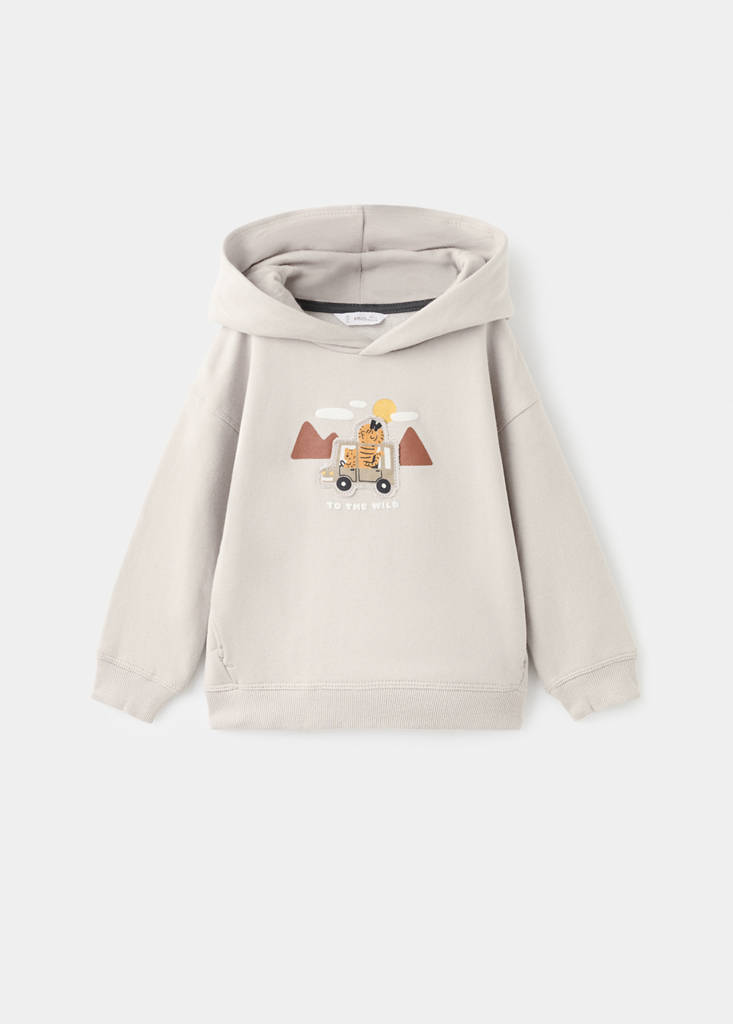 Katoenen stof. Binnenkant van geborsteld katoen. Recht ontwerp. Gedrukt ontwerp. Borduursel. Met capuchon. Lange mouwen. Borduursel aan de voorkant. Print op het voorpand