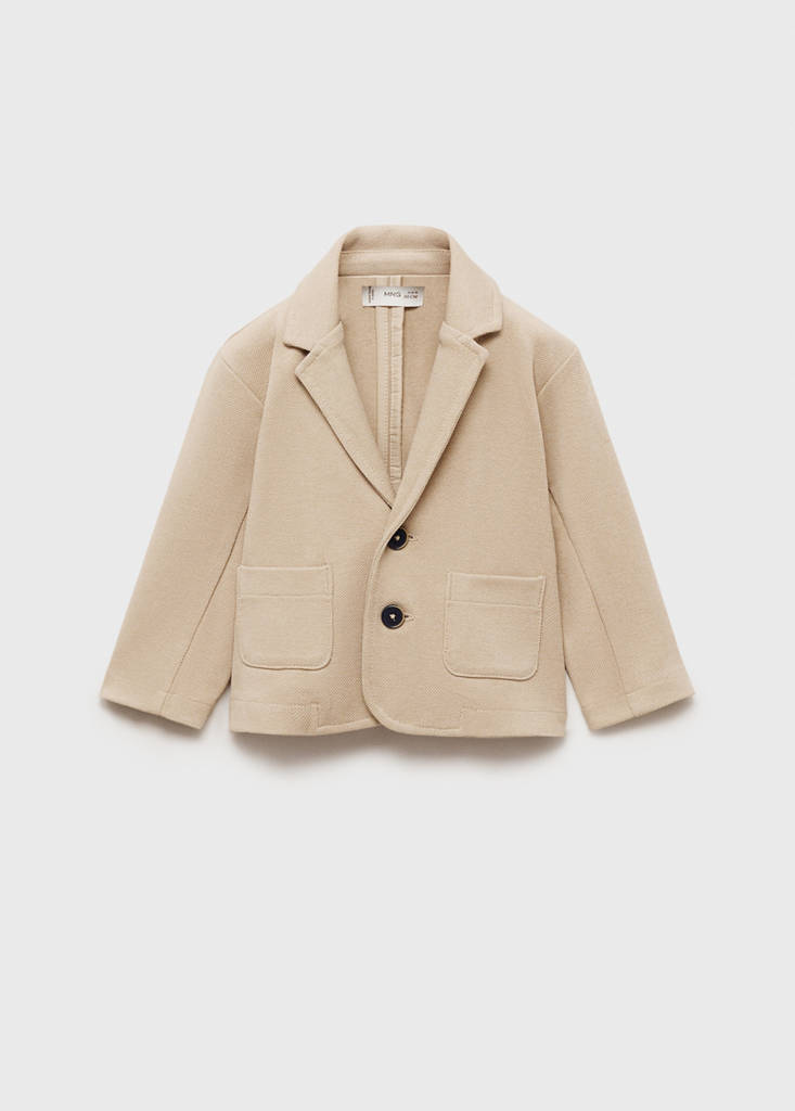 Cotton fabric. Straight design. Piquet fabric. Two patch pockets at the front. Lapel-collar V-neck collar. Long sleeves. Cuffs with decorative buttons. Back vent at the hem. Party, ceremony and communion collection