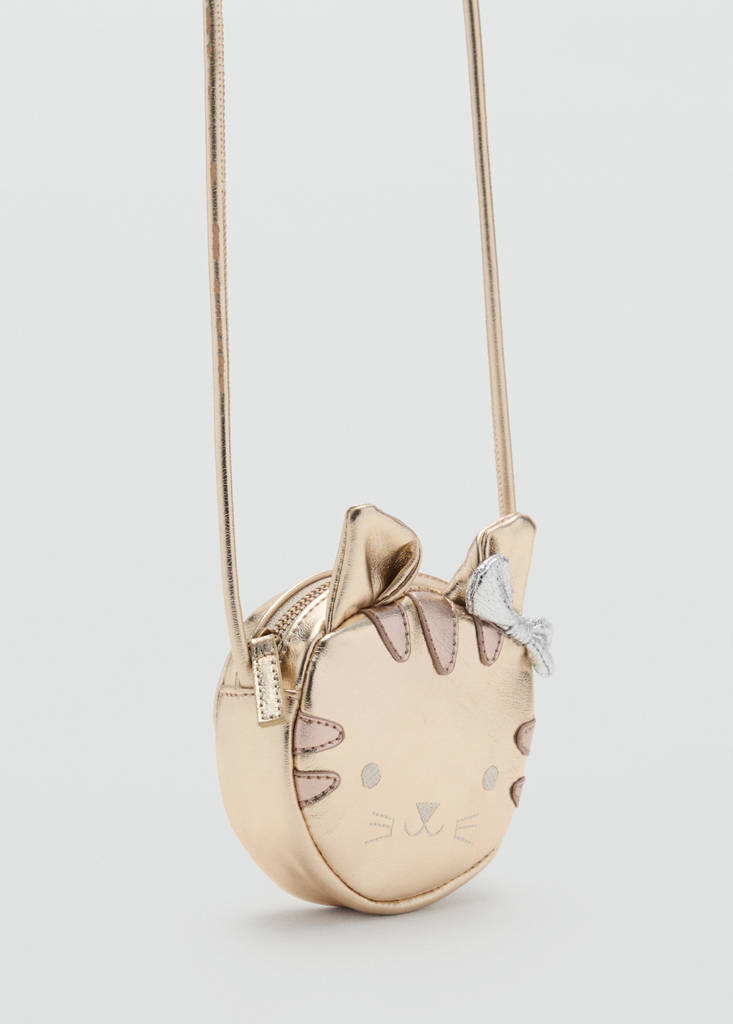 Metallic fabric. Kitty design. Decorative bow. Long strap. Zip closure