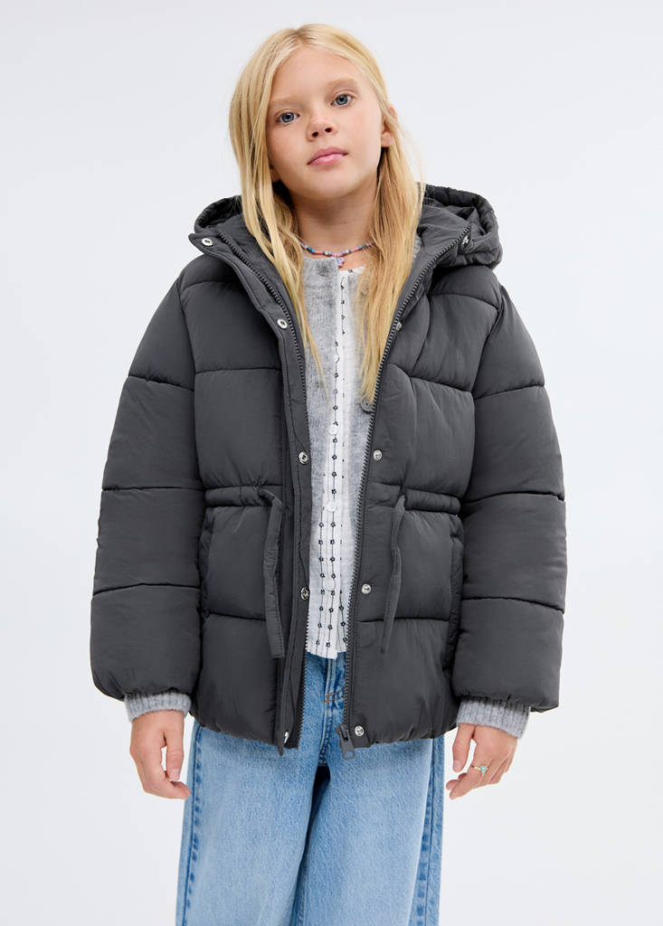 Quilted fabric. Straight design. With hood. Long sleeves. Two side pockets. Zip closure. Adjustable waist tie
