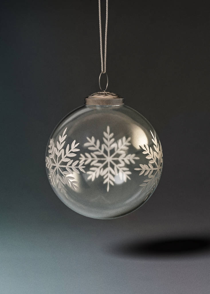 100% borosilicate glass. Diameter: 10cm. Height: 15.5cm. This pack of Christmas tree decorations consists of two transparent baubles, made entirely of glass, ideal for adding an extra touch of brightness to your Christmas décor. Each bauble features a delicate and elegant design with meticulously painted details to capture the essence of winter and provide a sophisticated and festive touch. Combine it with more products from the collection. Christmas Collection