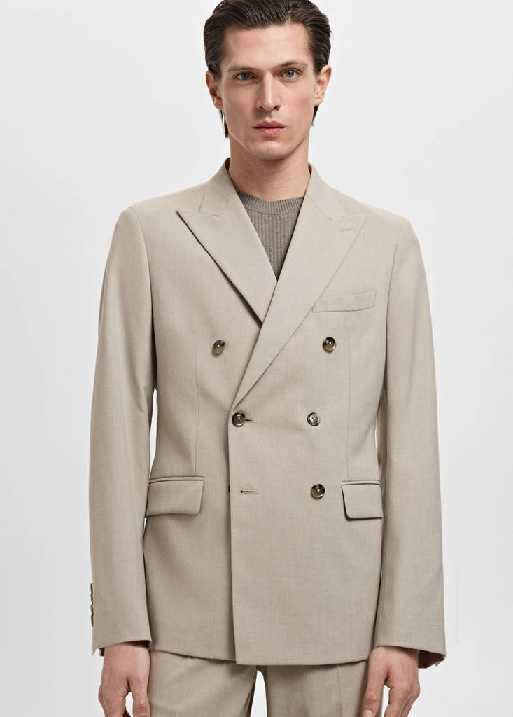 Slim fit. Tailoring collection. Notch lapels and buttonhole. Chest welt pocket. Design with double-breasted front closure. Two side flap welt pockets. Buttoned strap cuffs. Hem with side slits