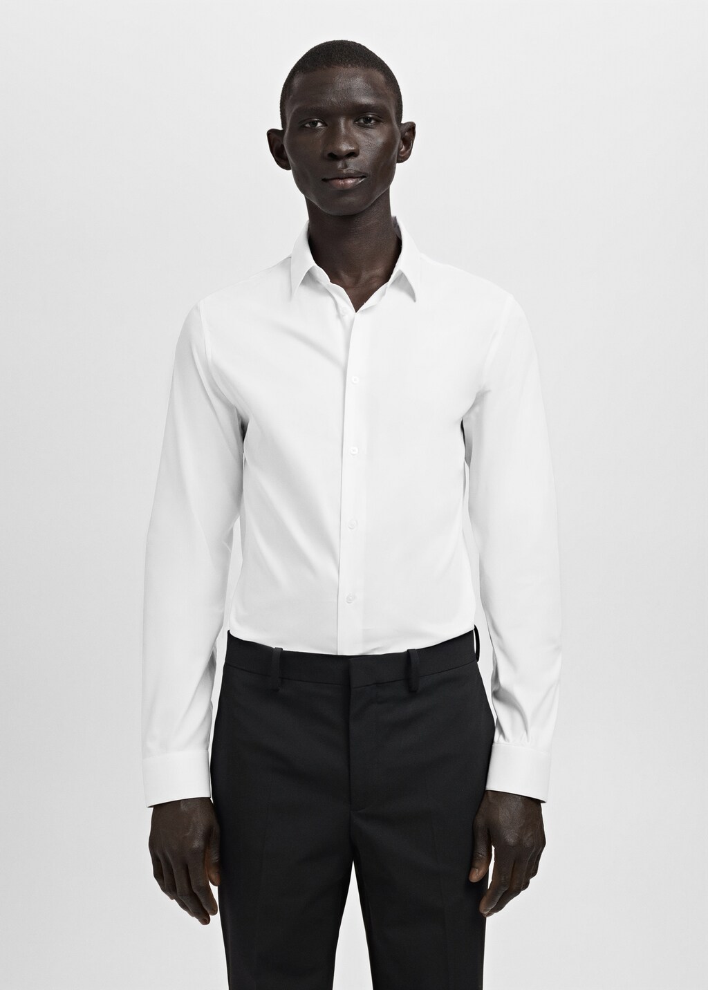 Shirt collar with lapel. Standard Length. Long Sleeve Length. Lightweight Flat Structure. Front Closure Location. Silhouette Super Slim Fit. Slim fit. Stretch cotton fabric. Classic collar. Front closure with buttons. Long sleeves with buttoned cuffs. Rounded base.