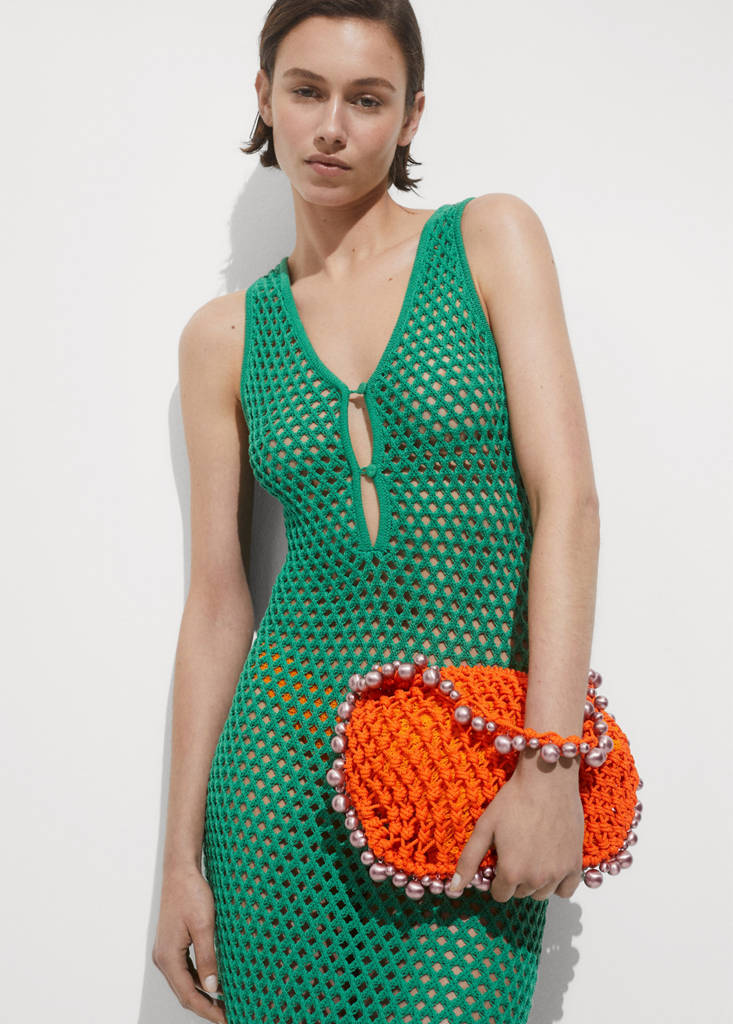 Medium. Shopper style. Braided design. Shoulder strap. No Fastening. Irregular beads. Decorative beads