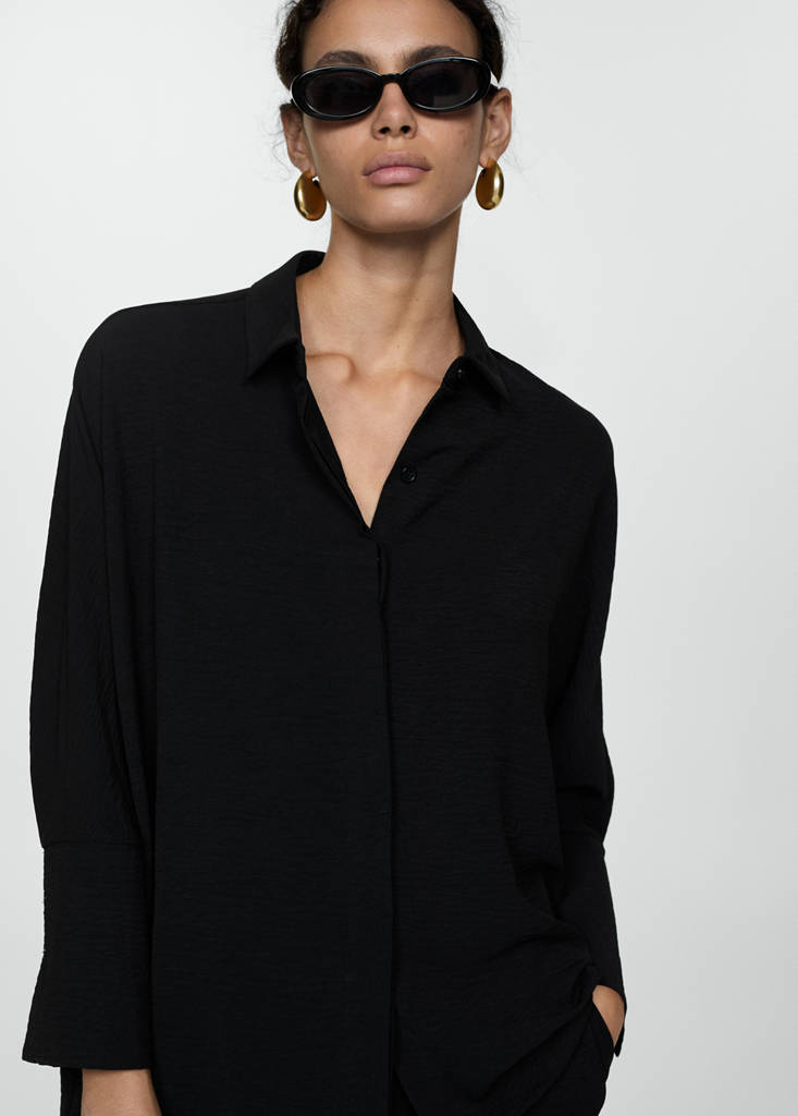 Textured flowy blouseCurrent price [kr 499,00 ]kr 499,00Select a colourBlackLarge garment - Choose one size down from the usualSelect your sizeXSNot available. I want it!SNot available. I want it!MNot available. I want it!LNot available. I want it!XLNot available. I want it!Notify meAdd to WishlistSee lookFree delivery to storeFluid fabric. Straight design. Shirt collar. Long sleeves with buttoned cuffs. Total look. Front closure with buttonsDetails, composition and careStore availability
