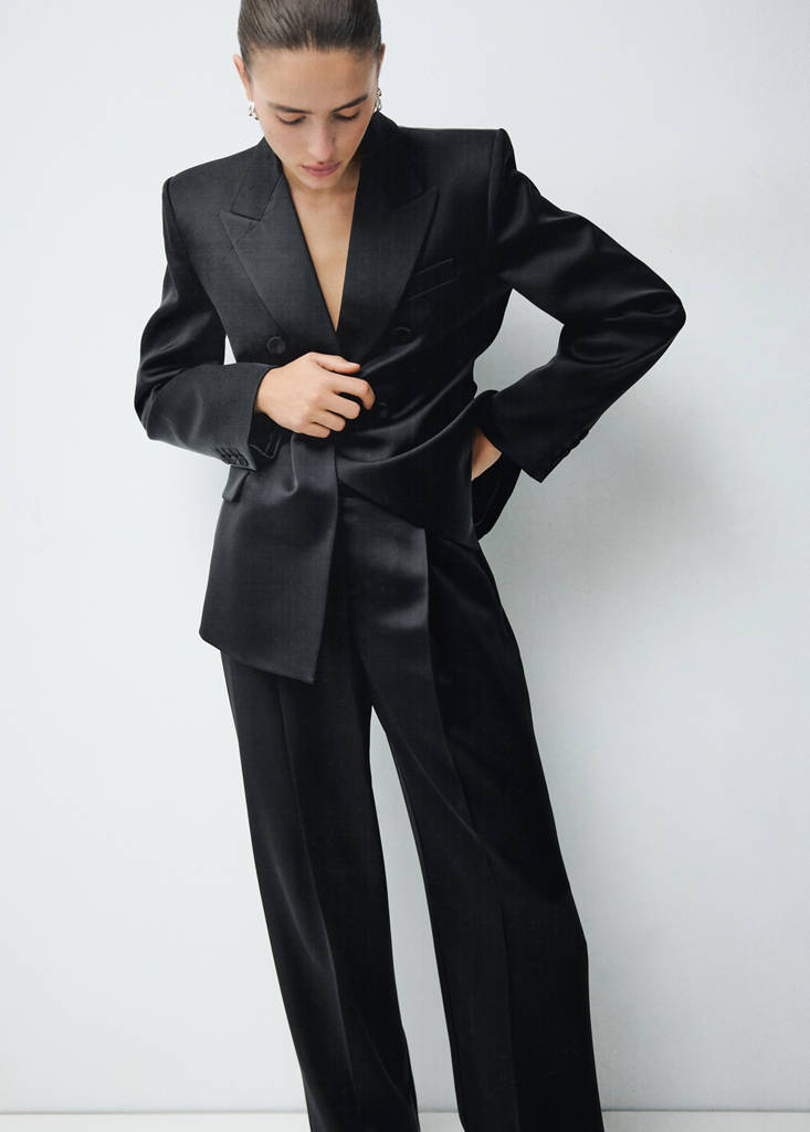 Satin fabric. Long design. Straight design. Mid-rise. Belt loops. Two side pockets. Two welt pockets at the back. Front pleat detail. Concealed button, hook and zip fastening. Total look. The colour black is exclusively online. This garment is part of our party and event collection, designed to elevate your looks for special occasions