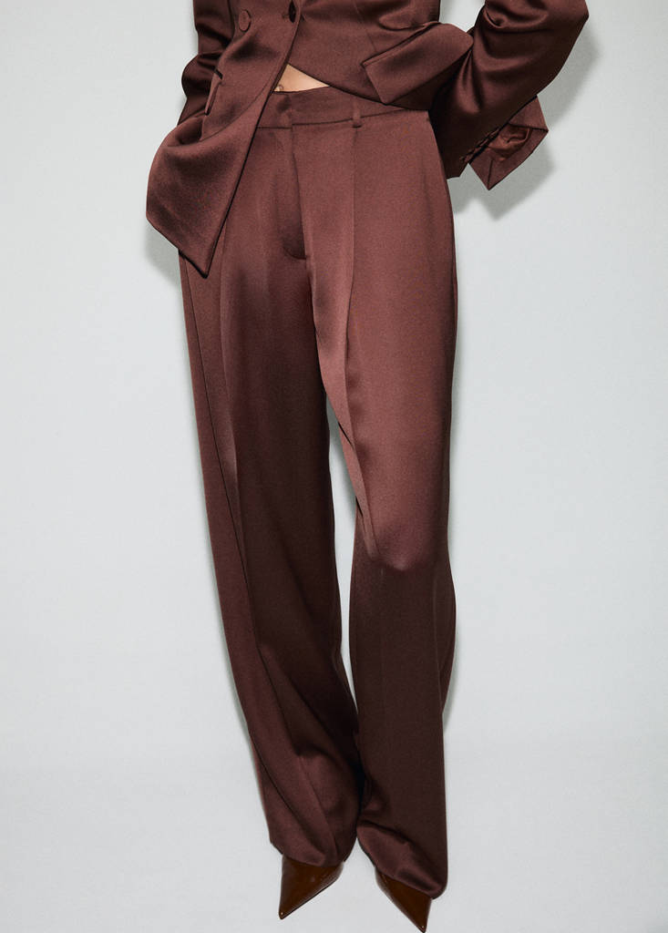 Satin fabric. Long design. Straight design. Mid-rise. Belt loops. Two side pockets. Two welt pockets at the back. Front pleat detail. Concealed button, hook and zip fastening. Total look. The colour black is exclusively online. This garment is part of our party and event collection, designed to elevate your looks for special occasions