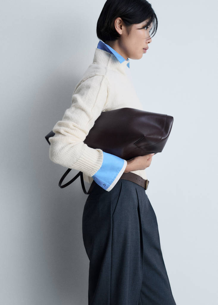 Strikket stoff. Rett design. Perkins krage. Lange ermer. Pyntesømmer. Uten lukking
