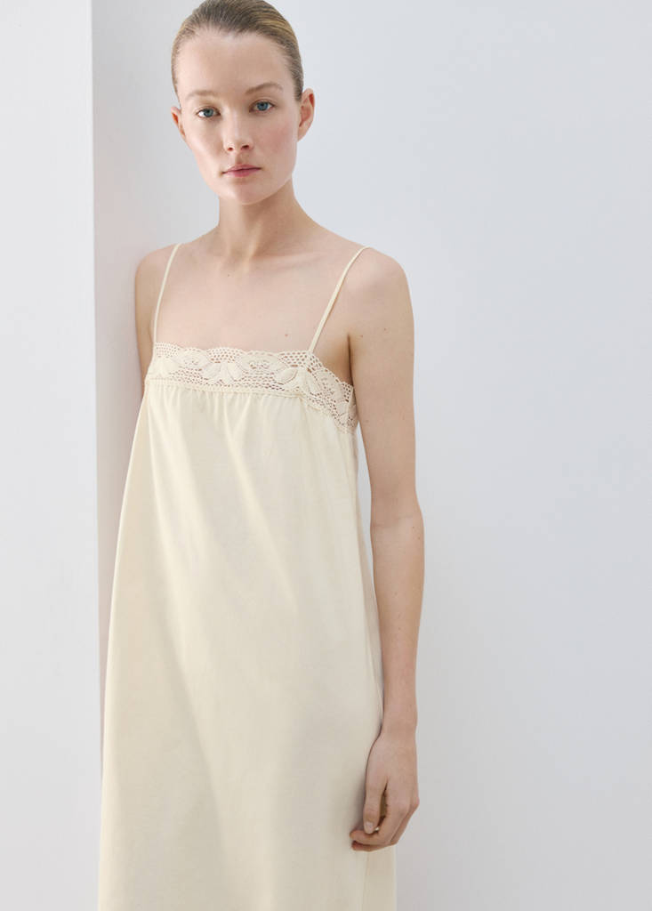 Nattkjole i bomull med blondekantGjeldende pris [kr 399,00 ]kr 399,00Velg en fargePastellgulModellen har på seg størrelse S og er 178cm høy.Velg størrelsen dinSMLLegg tilLagre som favorittVis lookGratis levering til butikk100% Bomull. Tynne stropper. Nattkjole i kjolestil. Rett hals. Blondedetaljer. Kort design. Gir komfort og bevegelsesfrihetDetaljer, sammensetning og vedlikeholdTilgjengelighet i butikk