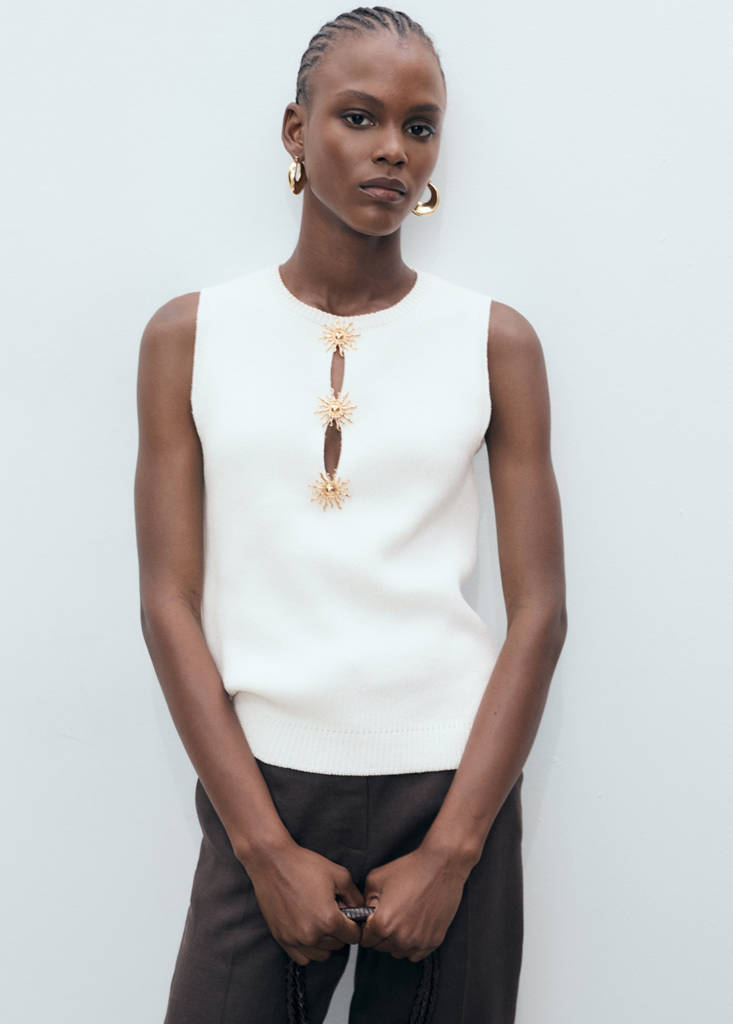 Bomullsblanding. Strikket stoff. Rett design. Rund hals. Ermeløs. Brede stropper. Knapper med juvelfinish. Sol-detaljer med åpning i utringningen. Uten lukking