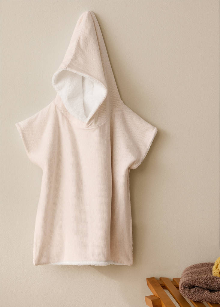100% Bomull. Vekt: 380gr/m2. Innvendig frottéstoff. Med hette. Korte ermer. For barn mellom 2–3 år. Tofarget melert stripete design med fargede tråder. Tilgjengelig i to farger. Passer sammen med flere artikler fra kolleksjonen