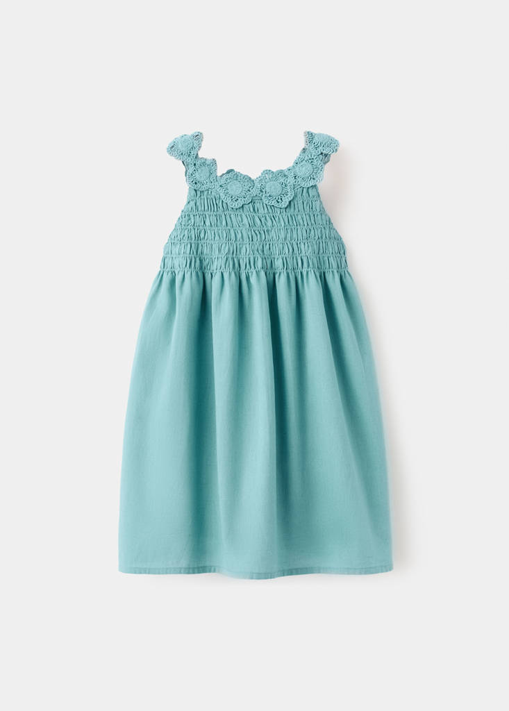Cotton and linen blend fabric. Textured fabric. Straight design. Short design. Round neck. Straps. Flower detail in crochet