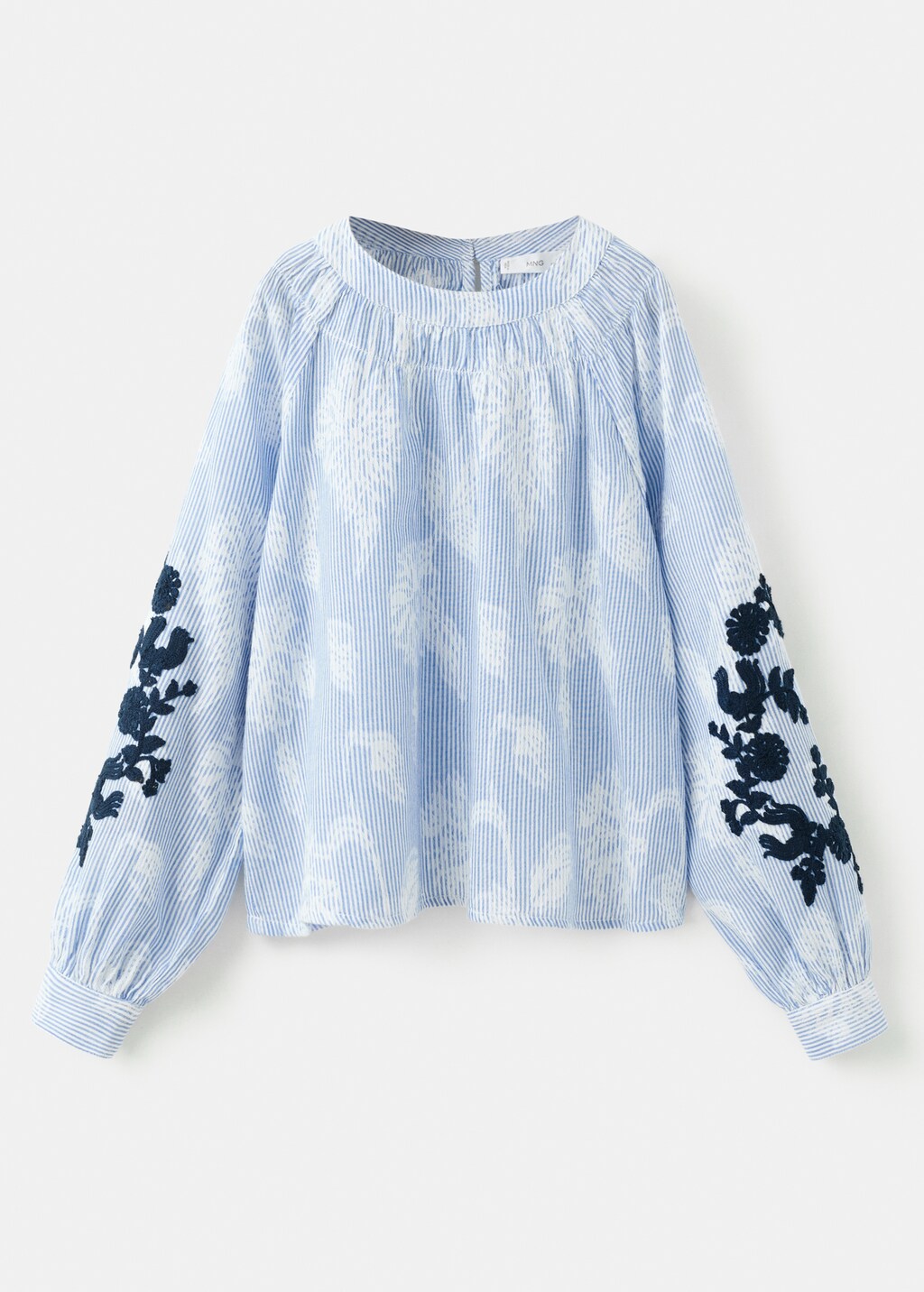 Crafted from 100% cotton fabric, this garment features a straight design with stripes and a floral print. The round neckline complements the long sleeves with buttoned cuffs, adorned with floral embroidery.