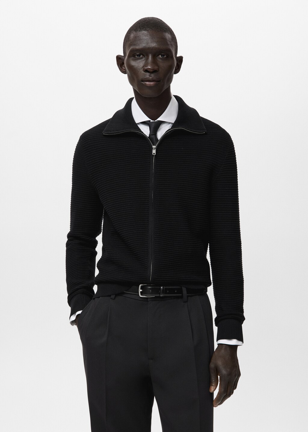 New NowStructured knitted cardigan with zipCurrent price [149.95 NZD ]149.95 NZDSelect a colourBlackSelect your sizeSMLXLXXLSize guideAddAdd to your wishlistSee lookFree delivery to storeSee availability in storeDescription100% cotton fabric. Straight silhouette. Structured knit fabric. Cable knit collar. Long sleeves with elastic cuffs. Front zip closure.See detailsShare