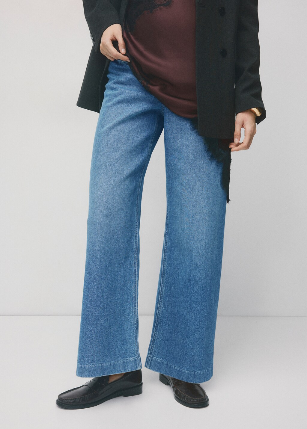 Denim-style cotton fabric. Stretch fabric. Long design. Wide-leg design. Low waist. Elasticated waistband. Soft elastic at front side waistband for added comfort and support the growing bump. Belt loops. Five pockets. Decorative button. Frayed hem. No Fastening. Maternity. Provides comfort and freedom of movement. We recommend you buy your usual size. Exclusive Online.