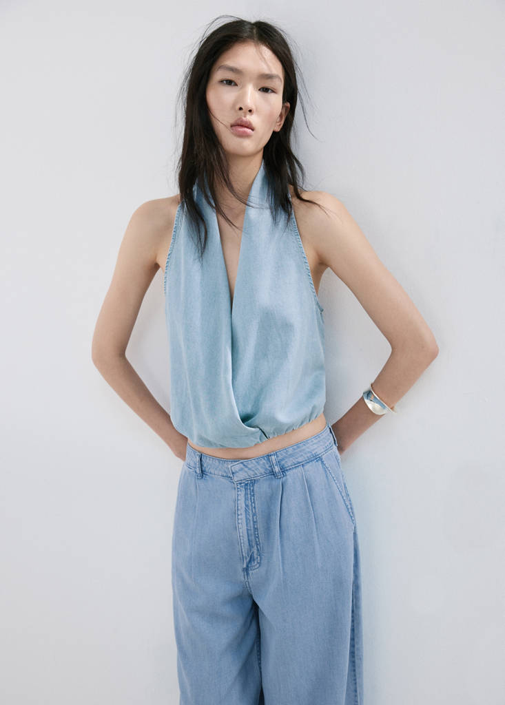 Cotton and lyocell blend fabric. Lyocell fabric in denim cowboy style. Wide-leg design. Long design. Regular Waist. Belt loops. Two side pockets. Button and concealed zip fastening. Total look