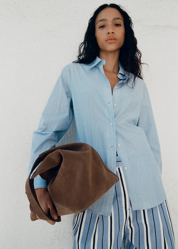 قماش قطن بأسلوب جينز. تصميم واسع الساق. تصميم طويل. تصميم مخطط. الخصر: عالٍ. حلقات للحزام. زر مخفي وخطاف وإبزيم بسحاب