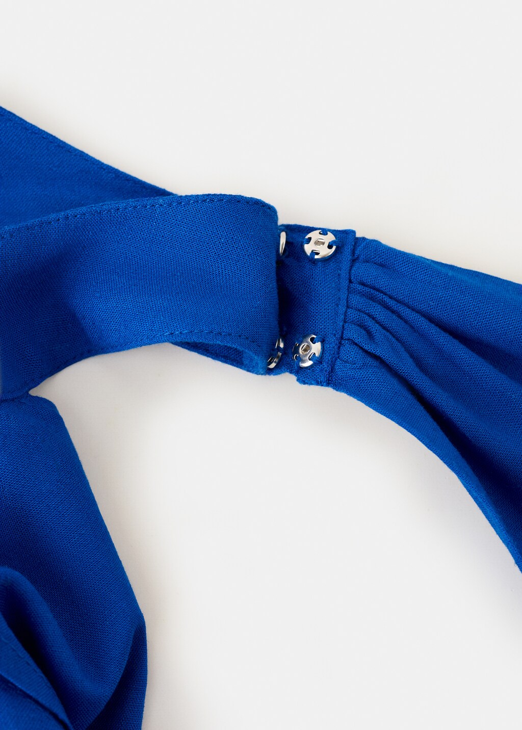 كتان. ياقة هالتر. زينة وشاح على الرقبة. دون أكمام. لوحة مجمعة عند الخصر. بدون سحاب.