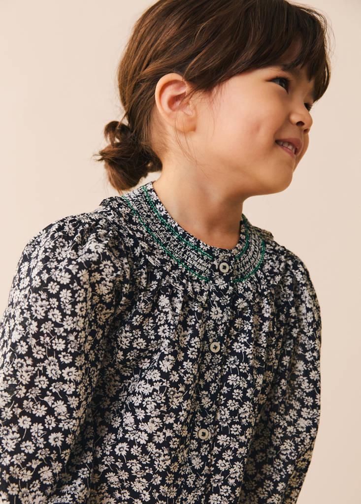 100% Cotton. Straight design. Embroidered details. Long puffed sleeves. Front closure with buttons. Round neck. Floral print