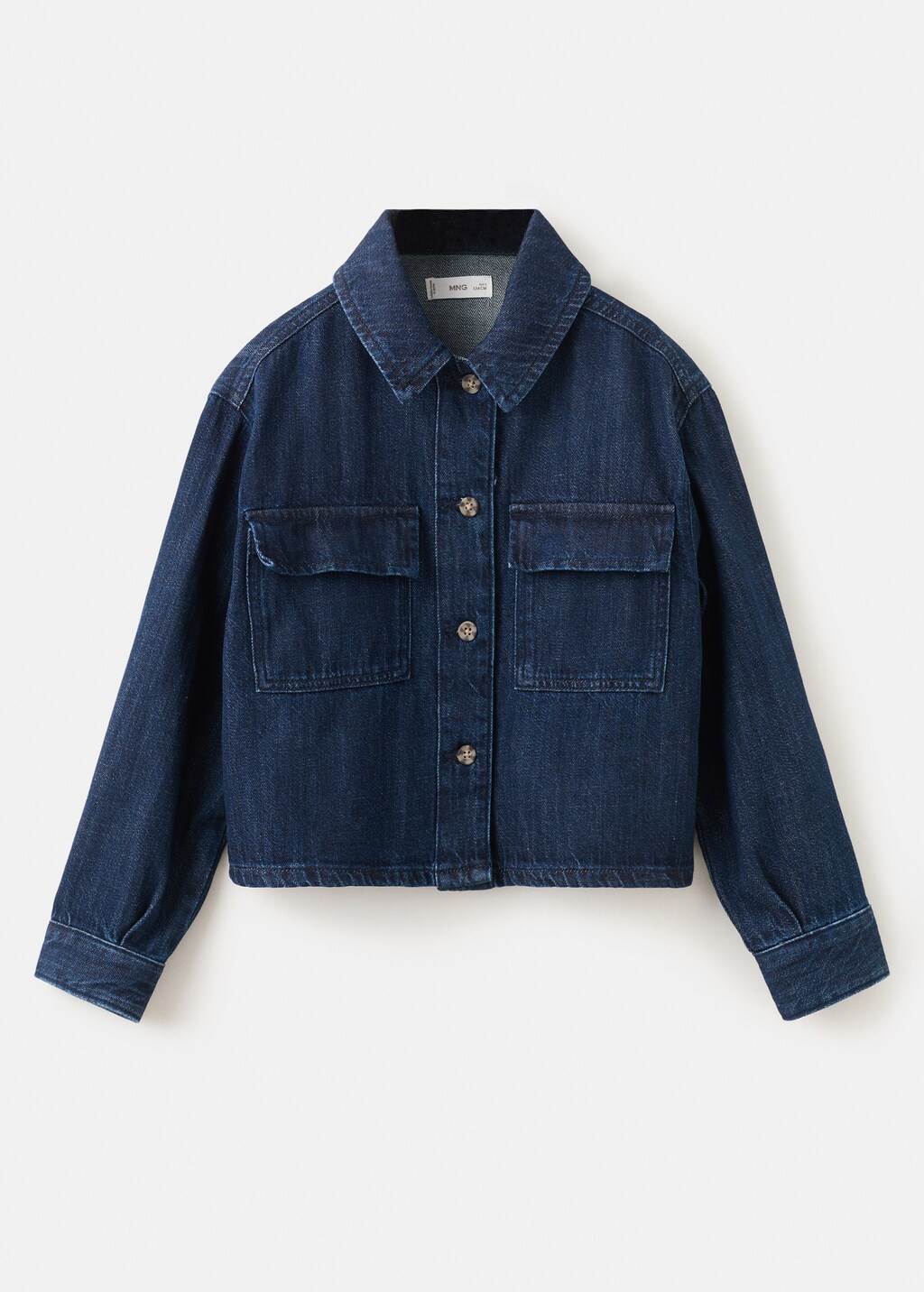 Crafted from denim-style cotton fabric, this garment features a straight design with a shirt collar and long sleeves. It includes two patch pockets on the chest and a front button closure.